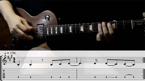 Παίζοντας το riff στην κιθάρα μας θα πρέπει να προσέξουμε στο μέτρημά μας τους αντιχρονισμούς – συγκοπές στον τρίτο χρόνο του πρώτου μέτρου και στον δεύτερο χρόνο του δεύτερου μέτρου.